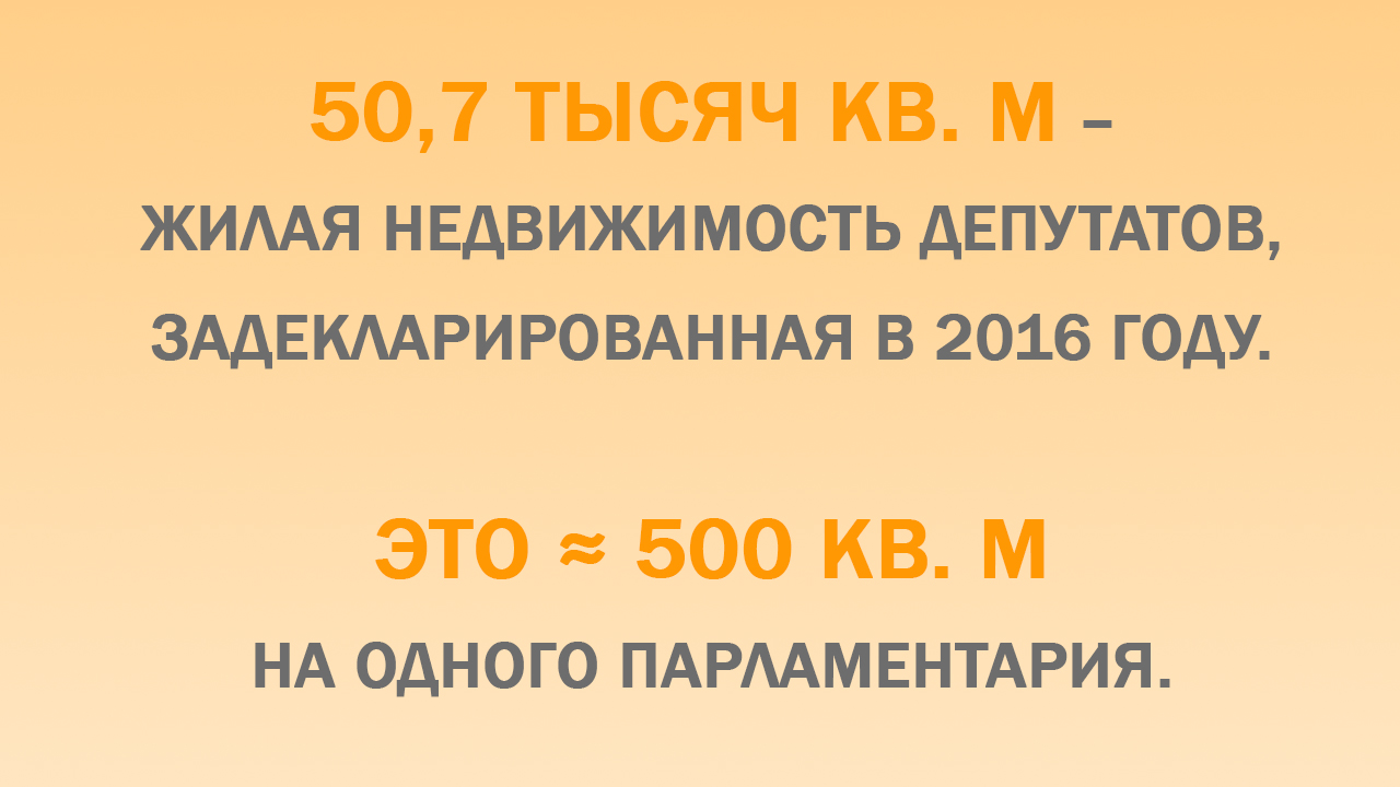 Общая площадь жилой недвижимости депутатов Госсовета в 2016 году составила 50,7 тысячи квадратных метров. В среднем, у депутатов есть по несколько квартир и домов. Не обходится и без садовых участков, бань, гаражей и тысяч квадратных метров нежилой недвижимости и земли. В среднем, на одного накожного избранника приходится по 500 кв. метров жилья.