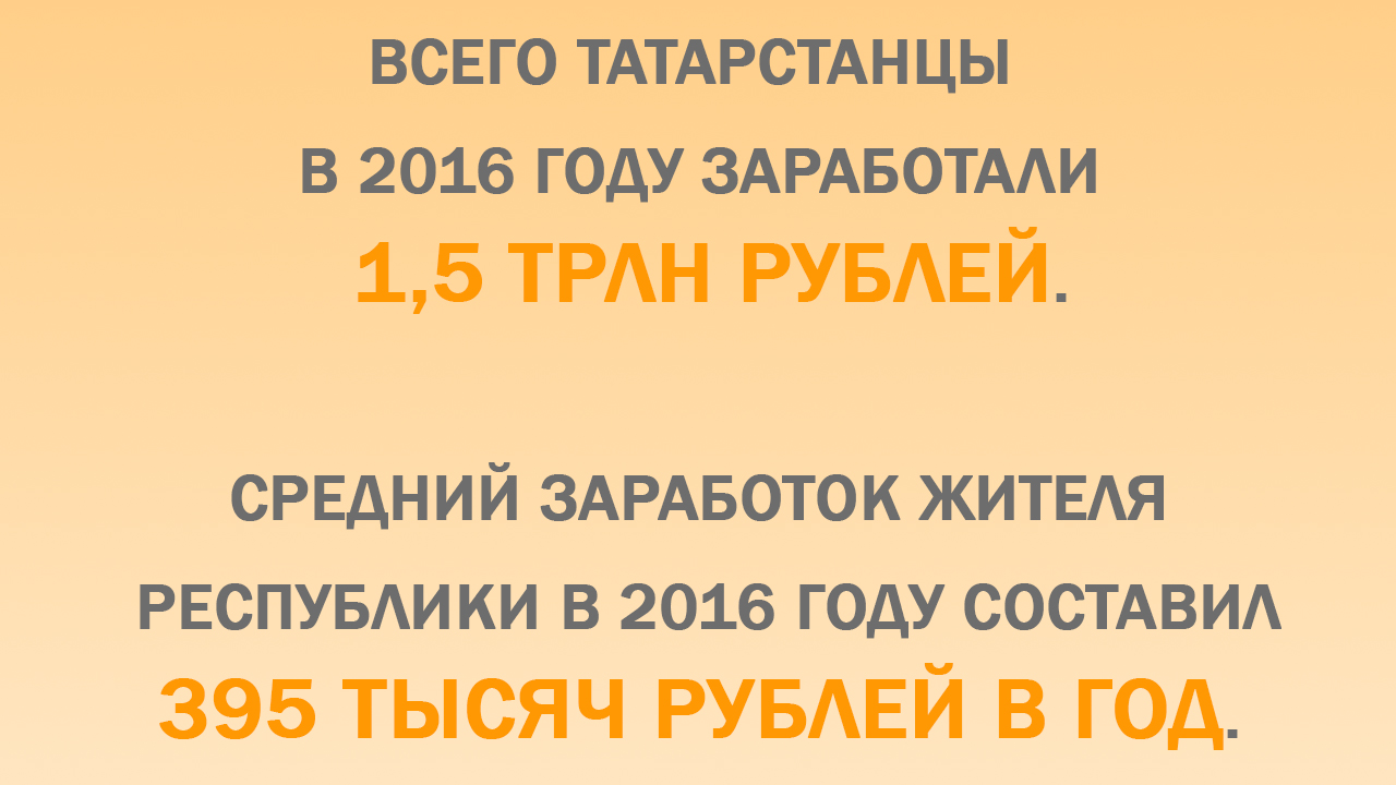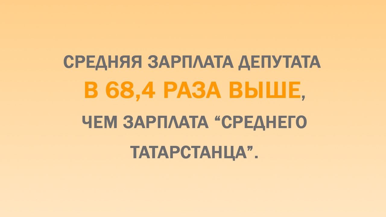 Для сравнения общий доходный фонд республики Татарстан, по данным Татарстанстата, составил в 2016 году 1,5 трлн рублей, а средняя зарплата жителя республики в год равна 395 тысячам рублей. Таким образом, средняя зарплата депутата татарстанского парламента в 68,4 раза выше, чем зарплата "среднего татарстанца". Даже самый "бедный" депутат заработал в 2,4 раза больше, чем "обычный житель республики". А вот сотня депутатов (это примерно 0,003% населения Татарстана) заработали 0,2% всех доходов жителей республики за 2016 год.