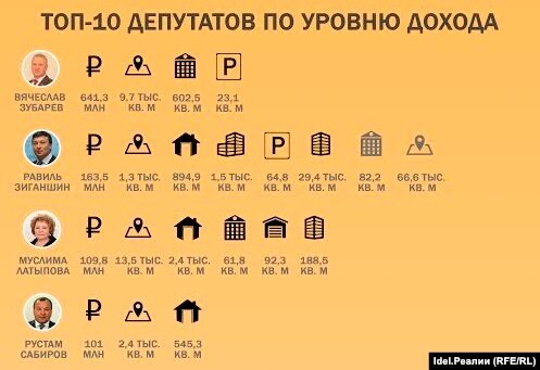 Отметим, что в 2014 году самый большой доход получил гендиректор ЗАО "Кулон" Альберт Фахрутдинов, заработав 727 млн рублей, а в 2015-м — гендиректор "ХК "Татнефтепродукт" Рустам Сабиров, задекларировав 1,8 млрд рублей. Тогда он заявил, что такая сумма получилась из-за продаже акций ТАИФу. В этом году народный избранник занял лишь четвертое место в топ-10 доходов депутатов.