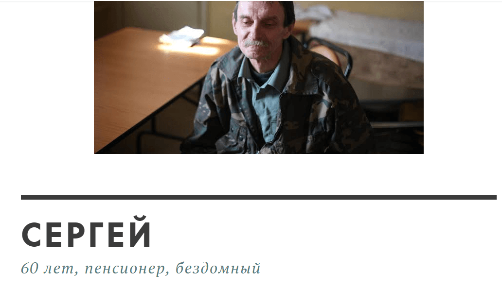Так начинается статья о бездомном на сайте благотворительной организации «Ночлежка»: фотоснимок, передающий эмоцию (герой не смотрит в кадр, выглядит расстроенным и задумчивым), после – разделительная линия, элемент верстки, простой заголовок и короткое описание. Изображение: скриншот с сайта homeless.ru