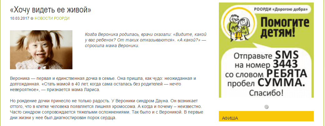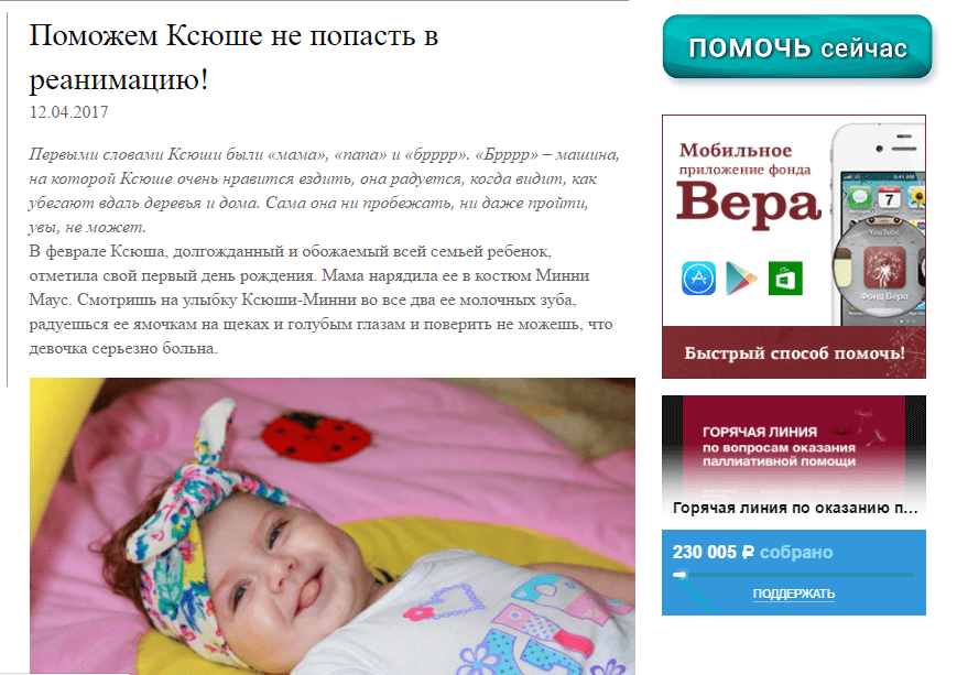 Пример короткого эмоционального заголовка, в нем нет имени девочки, но после заголовка мы видим фотографию и понимаем, что речь конкретно об этом ребенке. Также обратите внимание на структуру текста. Вводная часть выделена, большие отступы между абзацами. Текст легко воспринимается. Изображение: скриншот с сайта rordi.ru