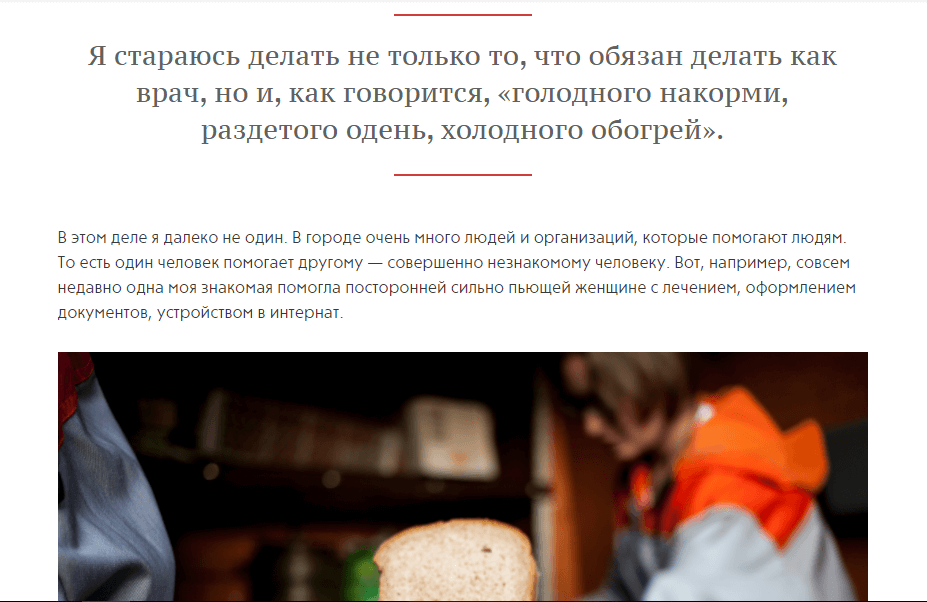Понятная структура текста на сайте благотворительной организации «Ночлежка»: яркая выделенная цитата, абзац и дальше фотоизображение. Изображение: скриншот с сайта homeless.ru