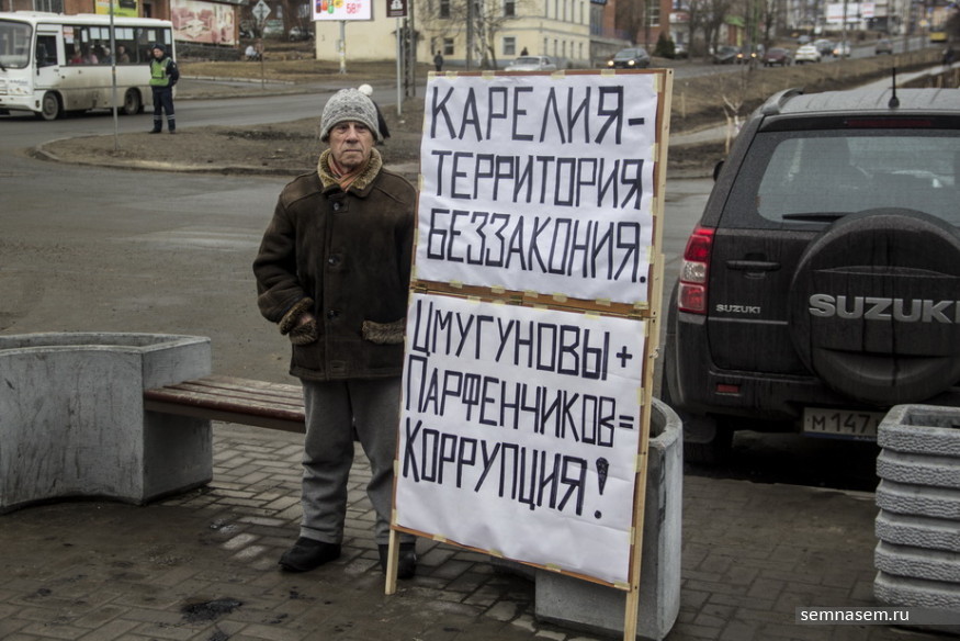 У «Невского пассажа» несколько нарядов полиции, ДПС, машина видеонаблюдения, вдалеке припаркован полицейский ПАЗик. Ветеран Великой отечественной войны Николай Бакинов встает у пристройки с одиночным пикетом. У него в руках плакат, с которым он уже выходил месяц назад. На плакате: «Карелия — территория беззакония!», ниже — фраза о Парфёнчикове и собственнике пристройки.