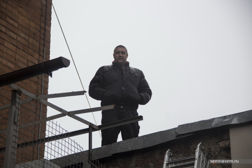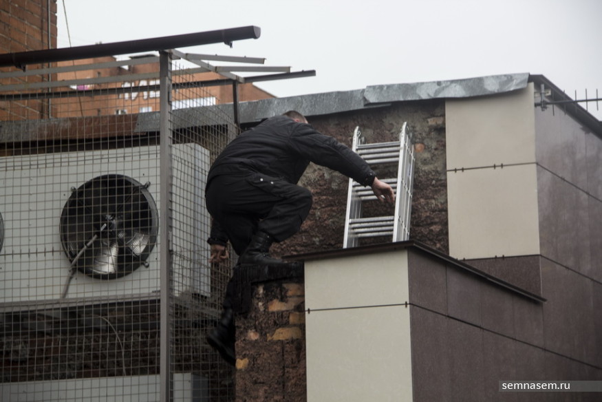 За окном — предприниматель Андрей Цмугунов, охранники и еще двое человек. Они не дают выйти на крышу. Двое активистов топчутся в оконном проеме. Звучат фразы: «Тихо-тихо», «Руки убрал! Руки, я сказал, убрал!», «Вы мне сломали камеру», «Это частная собственность. Для чего вам на крышу?».