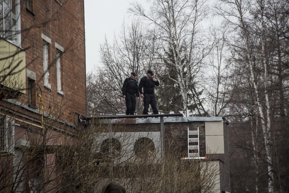 Примерно через полчаса активисты снова пытаются попасть на крышу, на этот раз с торца. В маленьком дворе несколько десятков человек: жители, журналисты, полиция. Снова на пути встают двое охранников, с ними собственники «Невского пассажа». Попасть на крышу не удается.