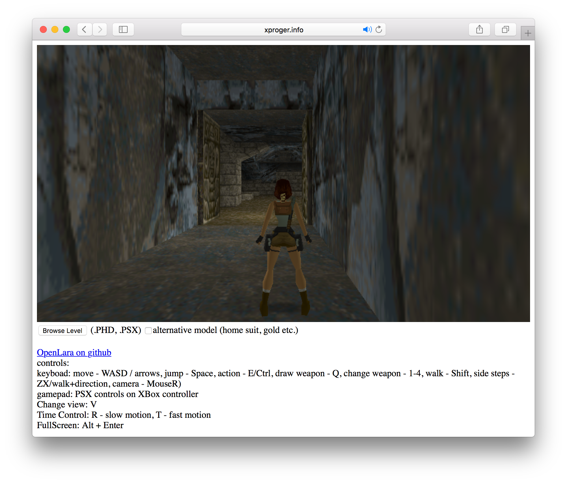 Самое интересное в OpenLara — демо-версия, работающая прямо в браузере. Если перейти на эту страницу, запустится уровень из Tomb Raider. Игрок может бегать, прыгать, выбирать оружие и стрелять. Если нажать на кнопки R и T на клавиатуре, происходящее в игре замедлится или ускорится. Другие уровни из игры предлагается загружать со своего компьютера (если они у вас есть).