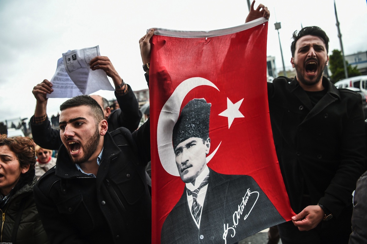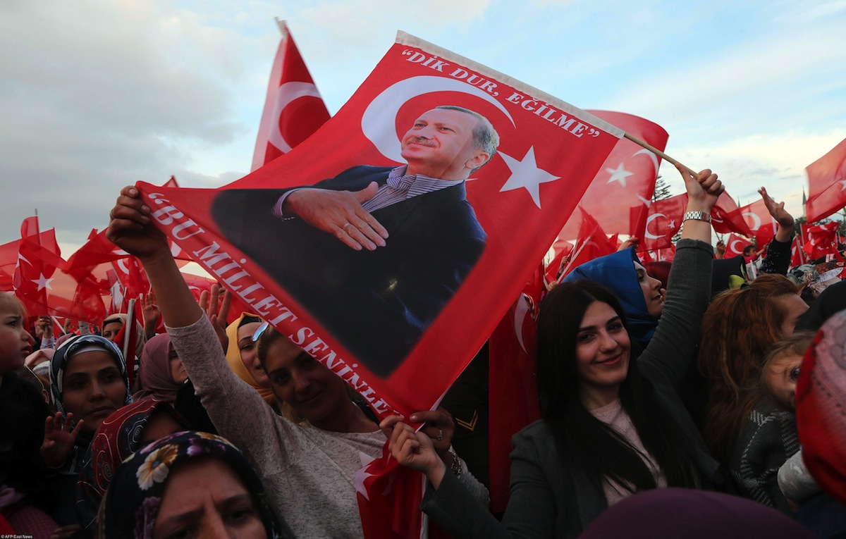 Референдум 16 апреля расколол Турцию на два равновеликих лагеря: против переформатирования страны из парламентской республики в президентскую — теперь Эрдоган сможет сам распускать парламент, планировать бюджет и предлагать законы — выступили около 49% избирателей, за — чуть более 51%. Перевес составил чуть менее 1,5 млн голосов, что для почти 80-миллионной страны — мизер*. Оппозиция потребовала пересчета 60% голосов из-за нарушений, включая сообщения о том, что незадолго до закрытия участков якобы были вброшены непроштампованные бюллетени. Иностранные наблюдатели сделали несколько замечаний к ходу голосования, сетуя на его «недостаточную непрозрачность», но при этом не выдвинули обвинений в фальсификации итогов референдума.