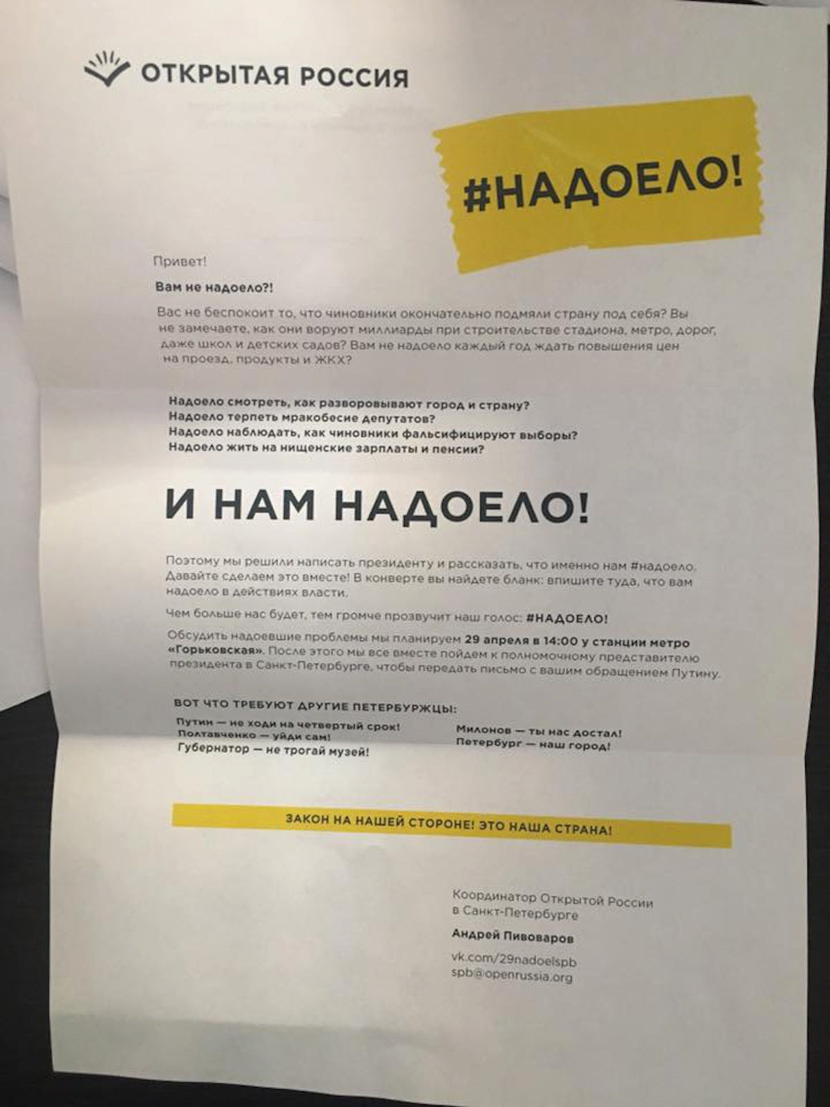 Митинги 26 марта выросли из конкретных претензий к конкретному человеку — премьер-министру Дмитрию Медведеву, против которого Фонд борьбы с коррупцией Алексея Навального выдвинул прямые обвинения. Это сработало, но это же стало и почвой для упреков: понятно, конечно, что Медведев для протестовавших — типичный представитель коррумпированной и несменяемой власти, и вопросы задавались власти в целом. Но все же многие отмечали, что для обозначения власти в целом есть персона куда более понятная, чем несамостоятельный и часто просто комичный премьер. «Открытая Россия» действует, учитывая эти упреки: мишенью акции «Надоел» стал президент Владимир Путин. Это он надоел. Это к нему с требованием уйти обратятся участники шествий 29 апреля. Кстати, ему же и понесут письма о его неучастии в выборах. В Москве планируется доставить их непосредственно в администрацию президента.