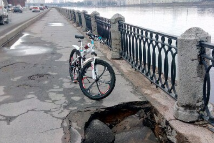 На Октябрьской набережной обрушился асфальт, сообщают очевидцы