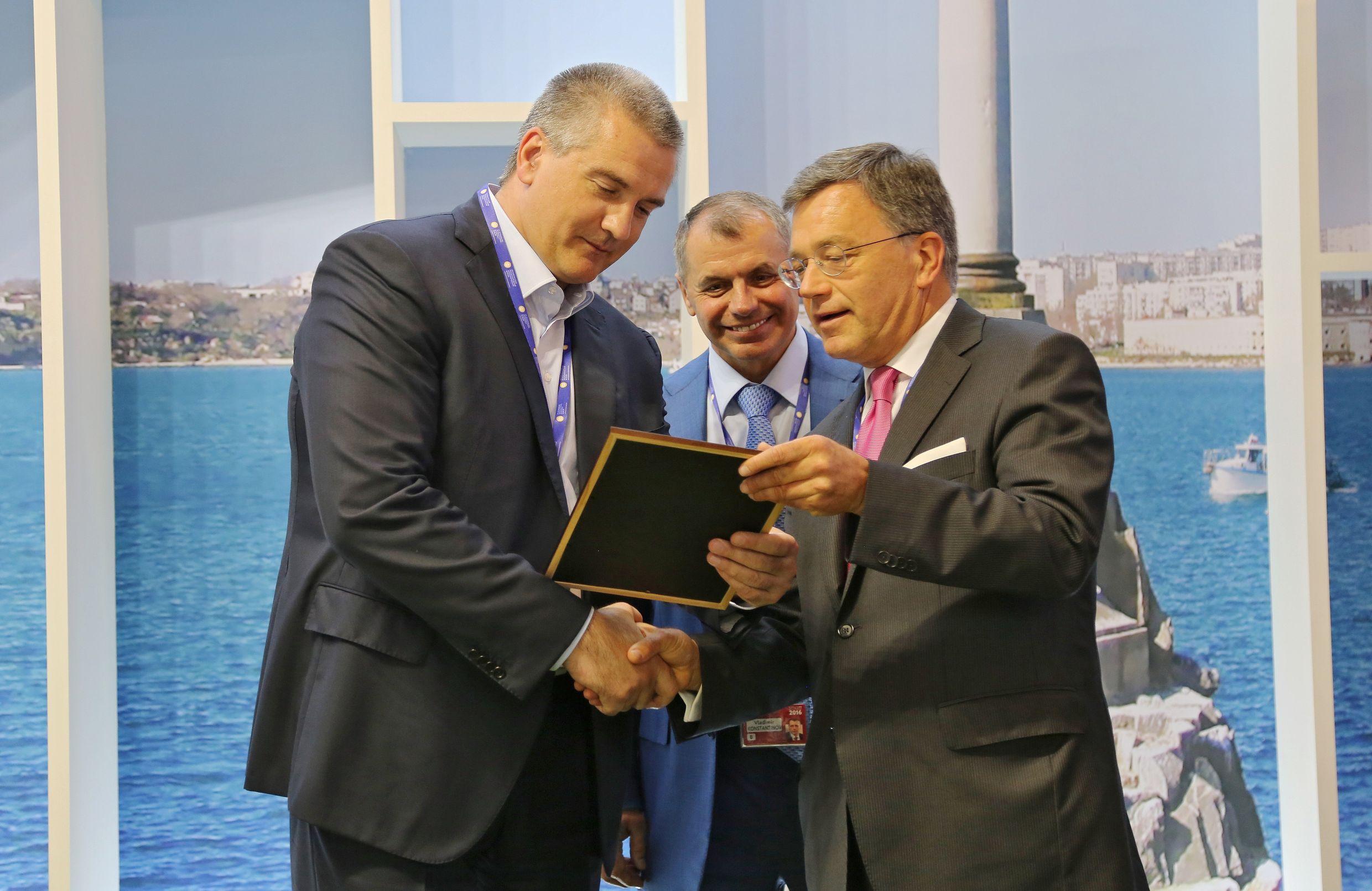 Сергей Аксенов вручает приглашение на ЯМЭФ-2017 президенту французской инвестиционной компании glava.rk.gov.ru Но и на Ялтинском форуме можно услышать интересные заявления. Так, быаший глава Администрации президента, а ныне спецпредставитель главы государства по вопросам природоохранной деятельности, экологии и транспорта Сергей Иванов предложил построить в Крыму и Сочи высокотехнологичные заводы по переработке мусора.