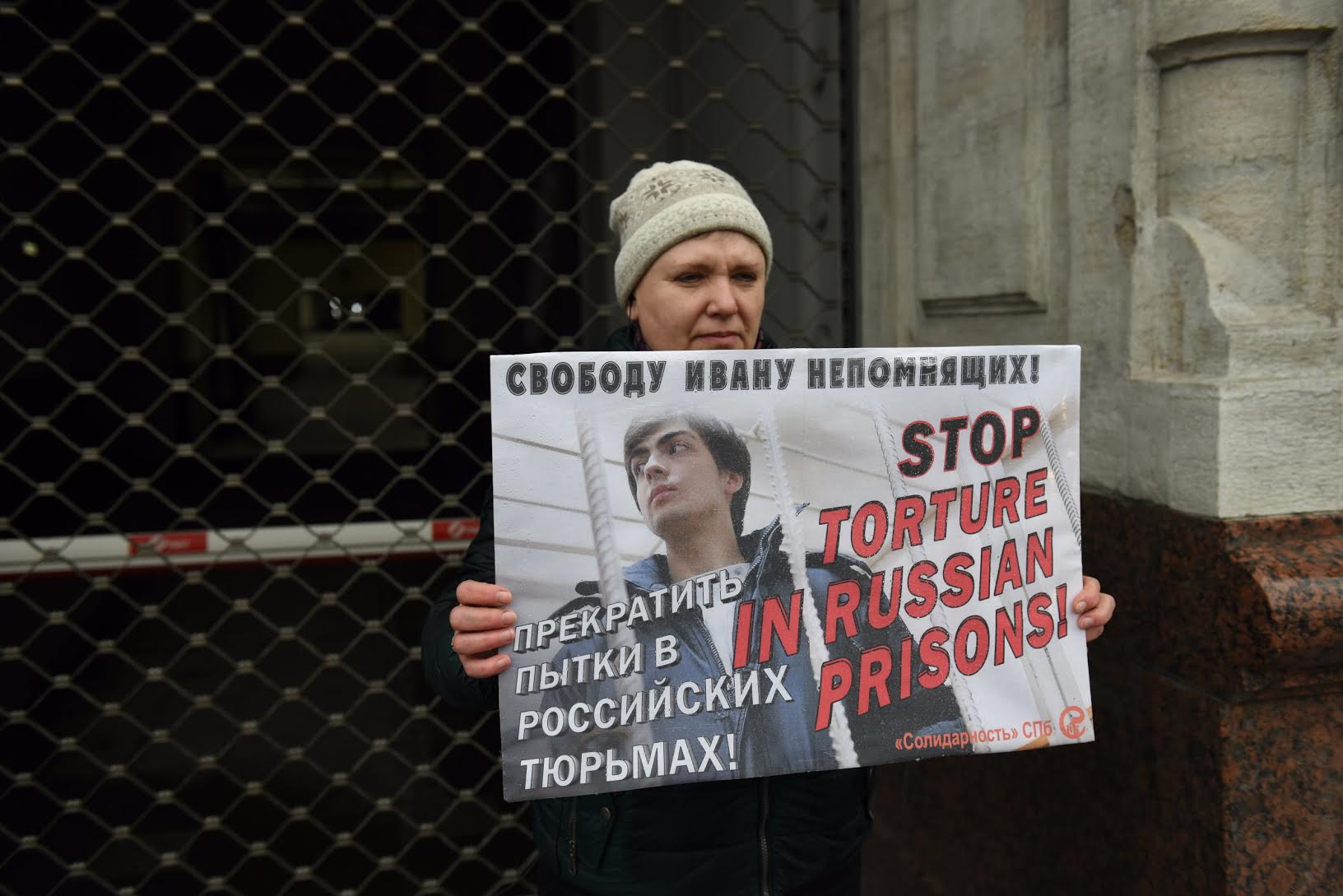 Около 10 активистов вышли на Невский проспект с плакатами в поддержку "узника 6 мая" Ивана Непомнящих, которого в Ярославской колонии вместе с "соседями" по ШИЗО избили спецназовцы Минюста. Одна из организаторов пикетов, активистка петербургского отделения движения "Солидарность" Ольга Смирнова считает, что вопиющий случай с Иваном Непомнящих напоминает ситуацию с Ильдаром Дадиным, которого тоже избивали в колонии, и что такие вещи не должны оставаться безнаказанными.