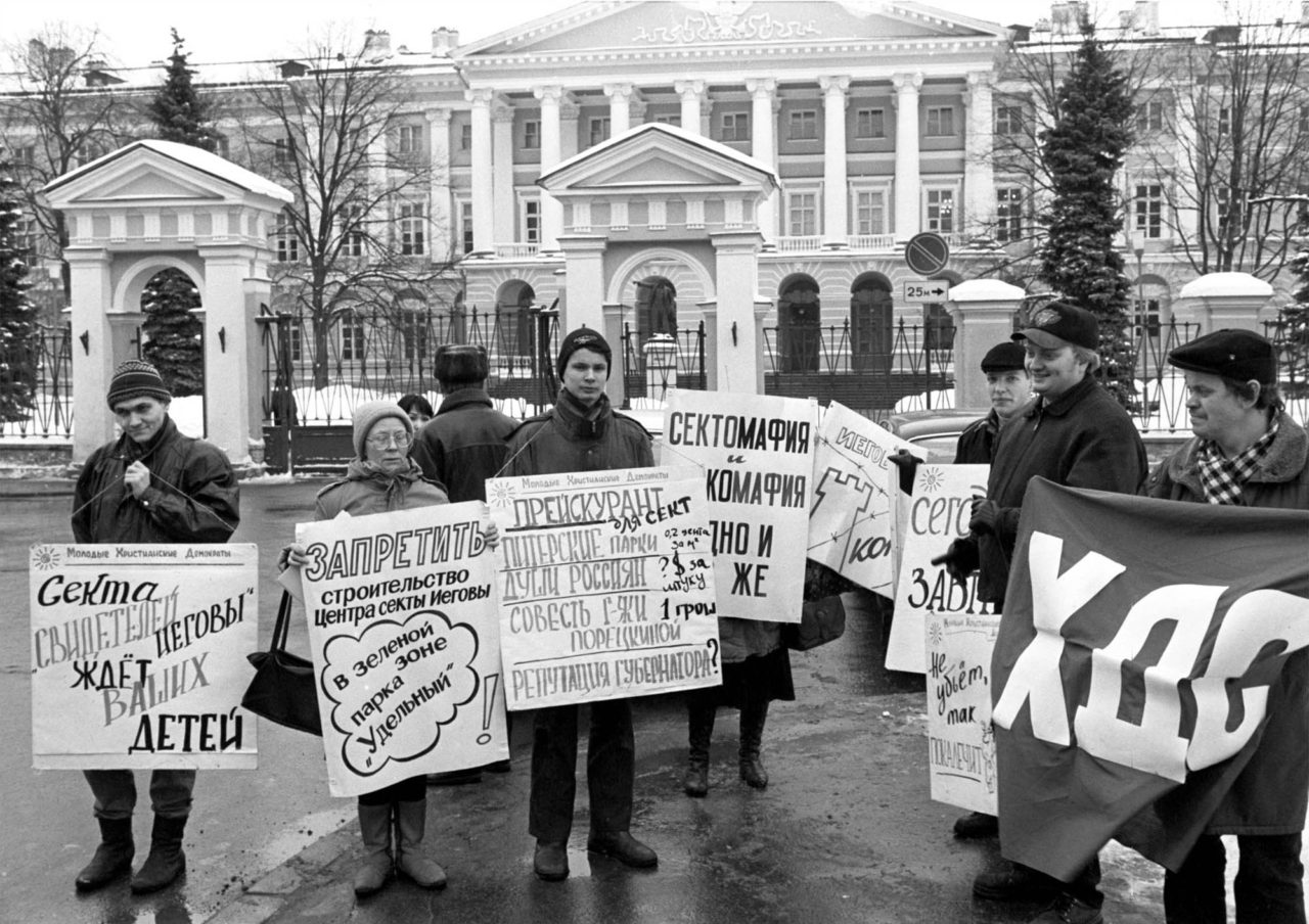 Акция протеста против деятельности иеговистов в Санкт-Петербурге. 1997 год.Фото: ТАСС Антикультизм в Россию привез бывший московский хиппи Александр Дворкин, эмигрировавший в США в 1970-е и подвизавшийся там в православных эмигрантских кругах. В начале 1990-х он оставил работу на радиостанции «Свобода» и вернулся в Россию, где сделал удачную карьеру на стыке интересов Московской патриархии и российских силовых ведомств. Упомянутый выше центр Иринея Лионского это, собственно, он.