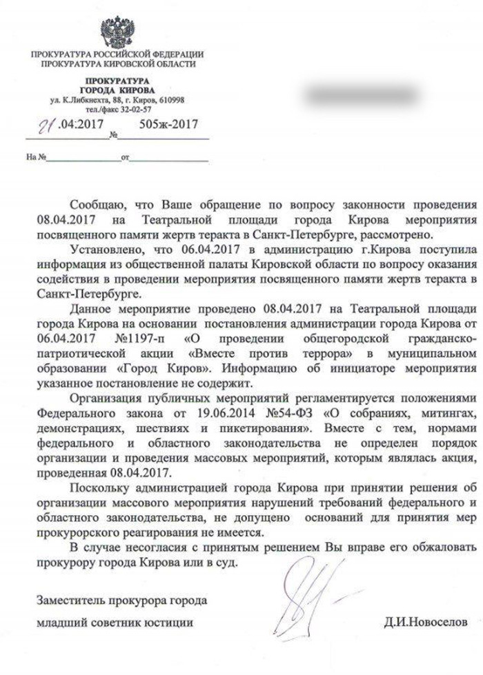 «Поскольку администрацией города Кирова при принятии решения об организации массового мероприятия нарушения требований федерального и областного законодательства не допущено, оснований для мер прокурорского реагирования не имеется», — сделан вывод в бумаге за подписью предположительно заместителя прокурора города Дмитрия Новосёлова.