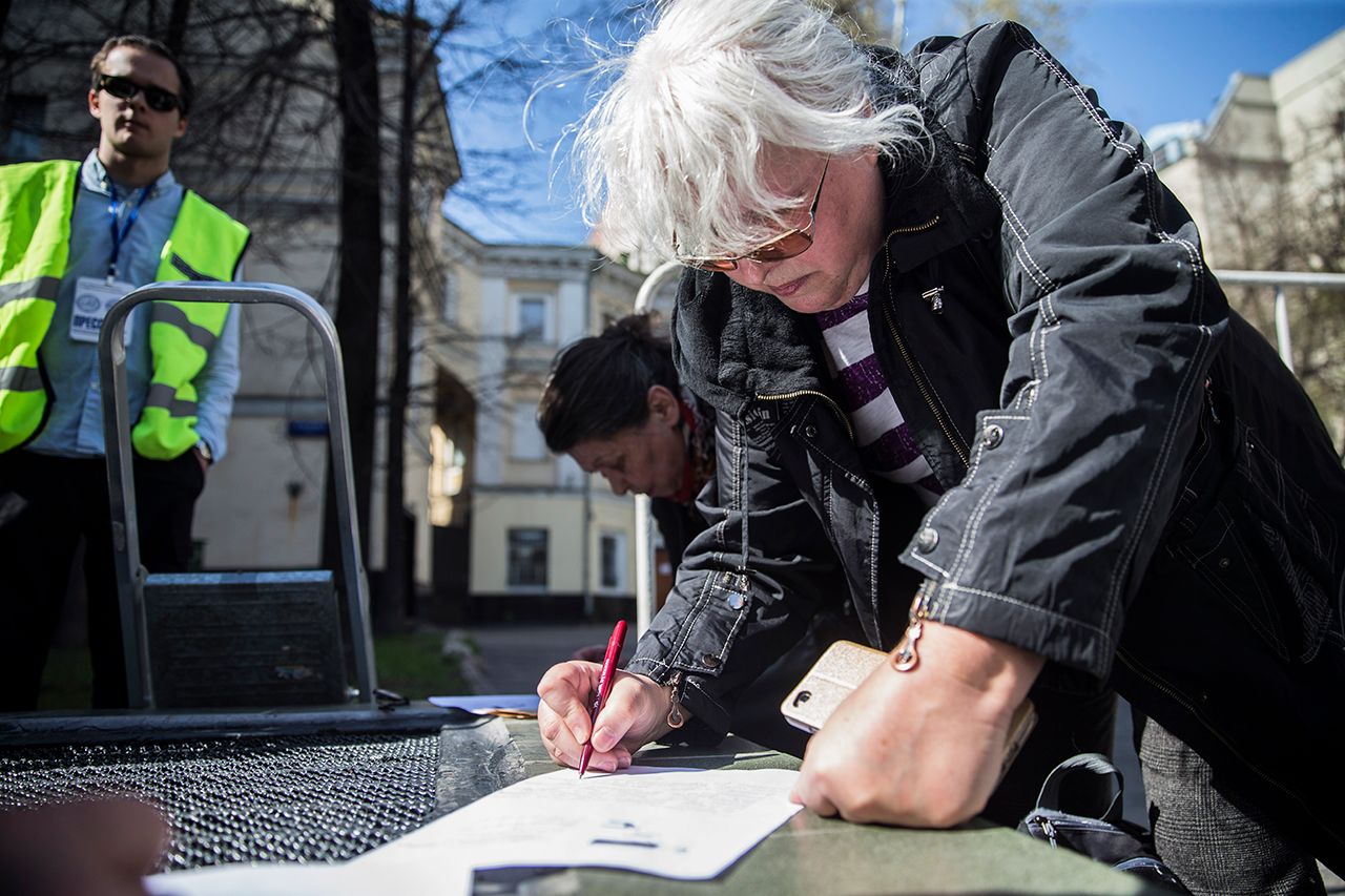 Полицейские ходили группами по два-три человека и повторяли в мегафоны: «Акция не согласована! Письма в администрацию президента можно подать на улице Ильинка!» Репортеры с телекамерами окружали наиболее разговорчивых участников акции. «Задержания 26 марта всех напугали, но нам надо тренировать себя дальше», — объяснял активист Марк Гальперин. Рядом ходила активистка «Национального освободительного движения» Мария Катасонова с портретом Путина на груди. На нагретом солнцем постаменте памятника создателям славянской азбуки лежал бездомный и с улыбкой наблюдал за происходящим.