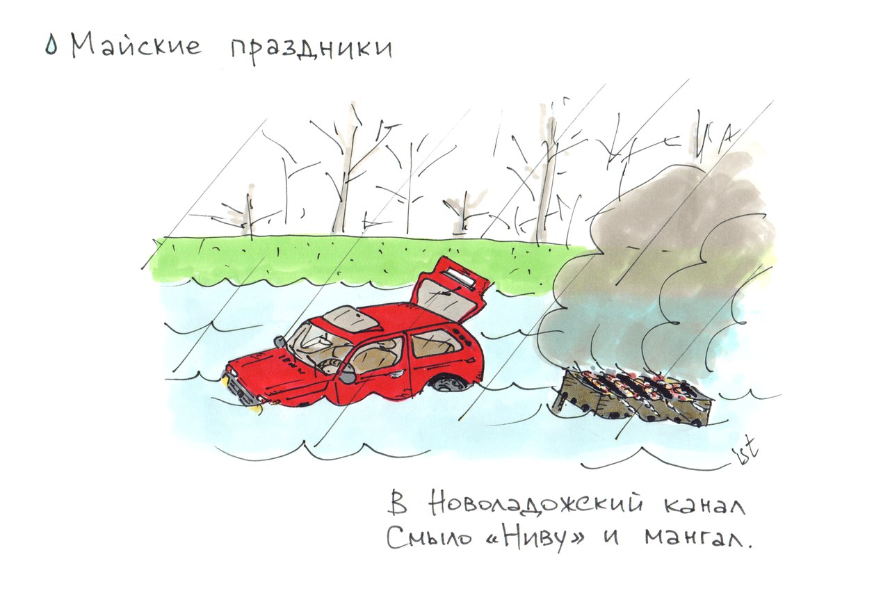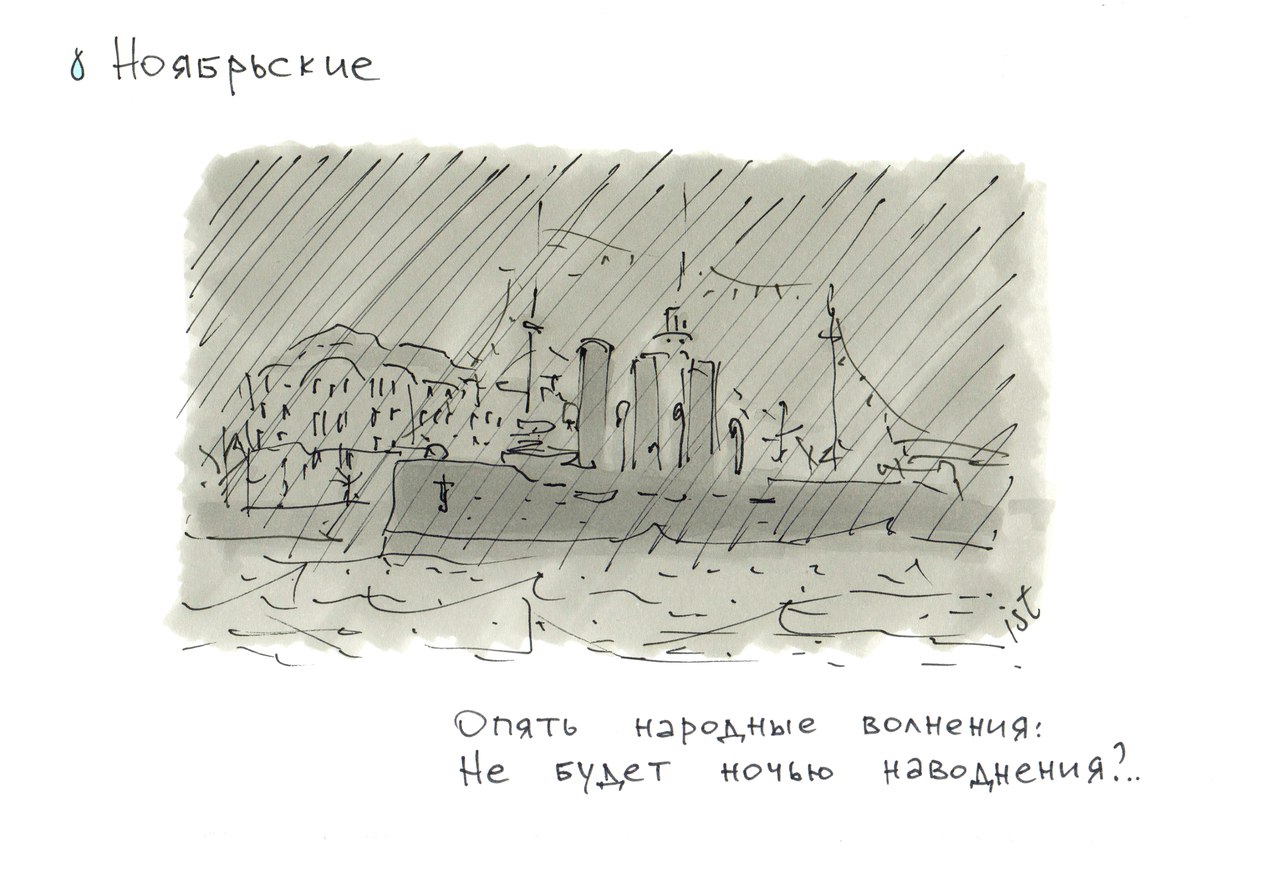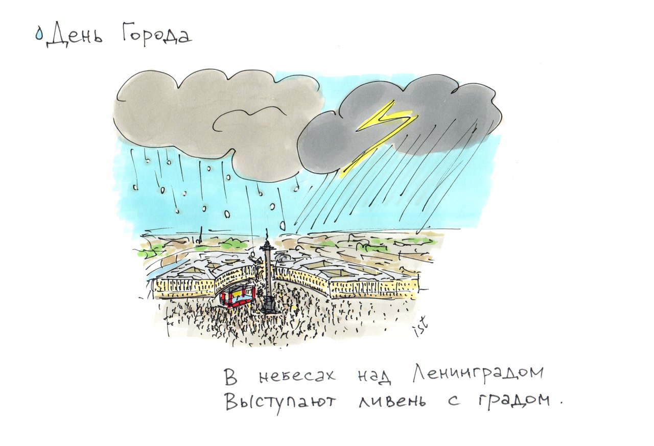 Иллюстратор Илья Тихомиров опубликовал в сети серию картинок о постоянных дождях в Петербурге. Ранее он уже выпускал сборник рисунков о петербургском метро, а также посвятил комикс очередям в Русский музей на выставку Айвазовского.