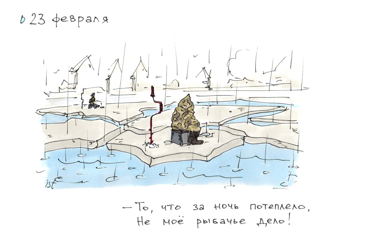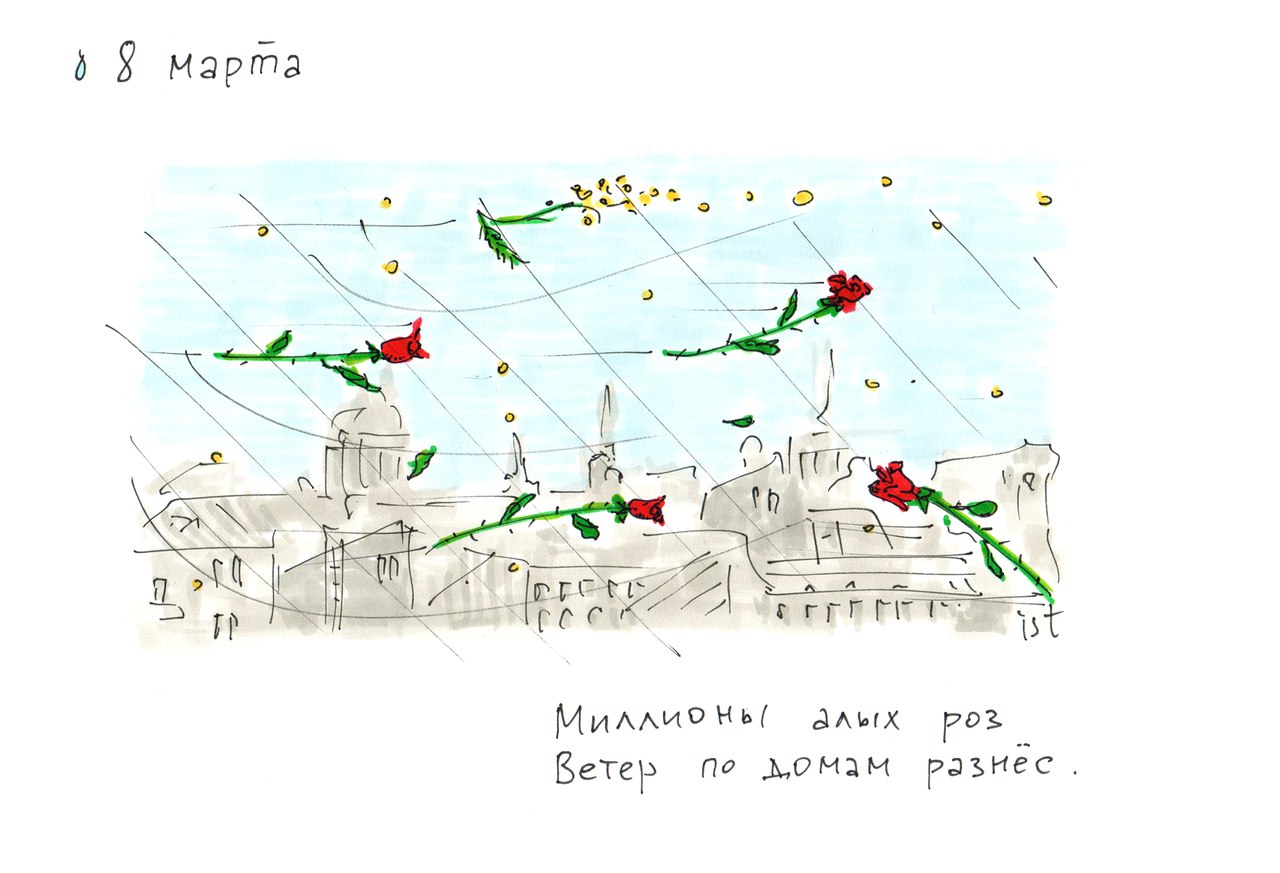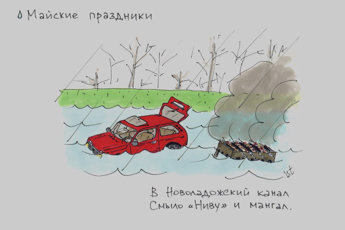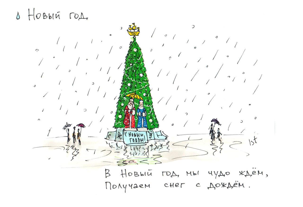 Иллюстратор Илья Тихомиров опубликовал в сети серию картинок о постоянных дождях в Петербурге. Ранее он уже выпускал сборник рисунков о петербургском метро, а также посвятил комикс очередям в Русский музей на выставку Айвазовского.