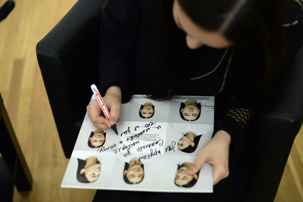 М: У меня тоже есть подарки. Я точно знаю, что хочу дать первый приз девушке, которая задала вопрос о «Галерее». Вручает кенгуровку. Потом достает свои призы: виниловые пластинки Manuscript. Кажется, девушка, которая получила «кенгурушку», расстроилась.
