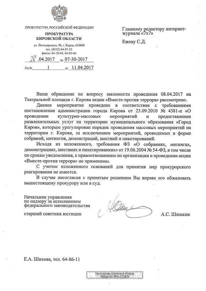 В телеграм-канале «Кировский шептун» 28 апреля появился документ, в котором говорится, что прокуратура не нашла нарушений законодательства при проведении акции против террора.