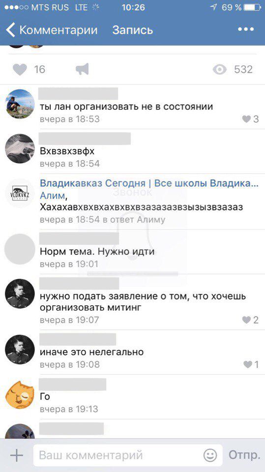 Они прошли, сели на диван и спрашивают: вы писали вчера в группе «Владикавказ сегодня» комментарий? А там был пост про митинг 12 [июня], спрашивали — что по этому поводу думаете? И я написал дословно: «Норм тема. Нужно идти». Все, больше ничего.