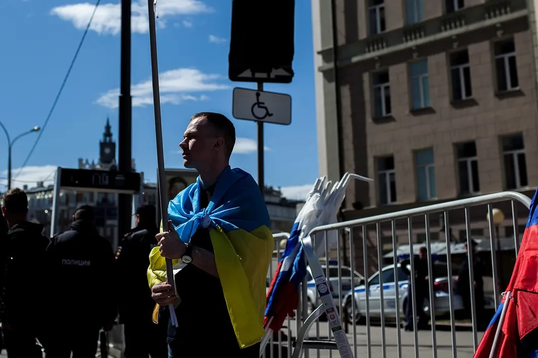 Ильдар Дадин, закутавшись в украинский флаг, общается с журналистами: