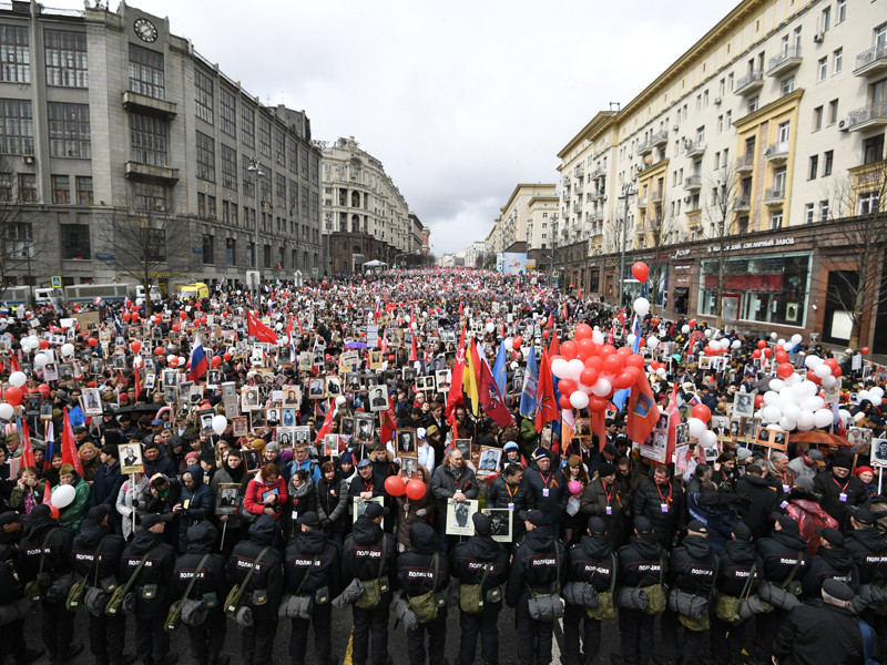 В Москве прошла акция "Бессмертный полк", приуроченная к 72-й годовщине победы в Великой Отечественной войне. Шествие, во время которого люди несли фотопортреты своих родственников, участвовавших в войне, стартовало от станции метро "Динамо". В акции уже в третий раз участвовал президент Владимир Путин. По данным МВД, к началу мероприятия насчитывалось более 600 тысяч участников. К окончанию, около 19:00, в министерстве сообщили, что нынешняя акция установила рекорд по численности - 850 тысяч человек.