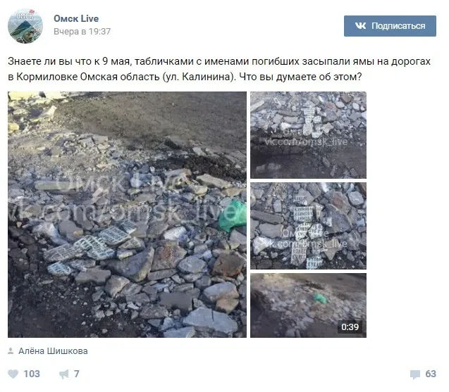 Следственный комитет по Омской области и региональная прокуратура начали проверки после сообщений в СМИ и соцсетях о том, что яму на дороге в поселке Кормиловка засыпали осколками мемориальной плиты с именами погибших в Великой Отечественной войне. Фото опубликовали пользователи соцсетей и местные СМИ.