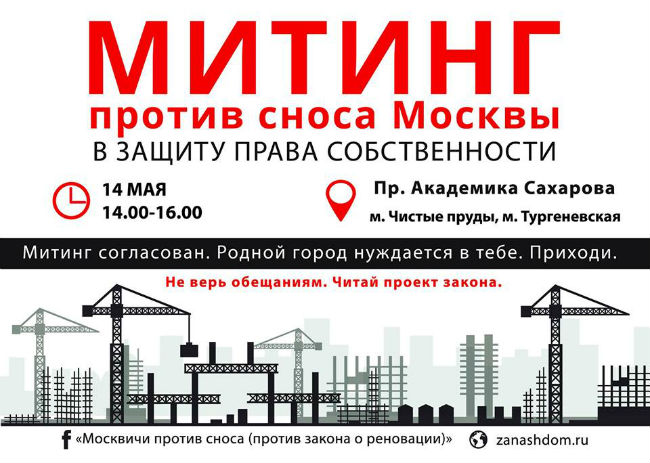 14 мая в 14:00 в Москве на проспекте Сахарова начнется согласованный митинг "против сноса Москвы, в защиту права собственности". За два дня до акции организаторы решили отказаться от "политизации" - провести митинг без выступлений политиков, без партийных флагов и символики. Многие активисты критикуют это решение.