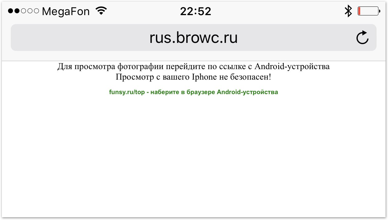 Петухов решил посмотреть со своего айфона, что ему прислали, но у него ничего не вышло: по ссылке открылась страница с просьбой воспользоваться телефоном на Android. При этом авторы сайта утверждали, что просмотр контента с айфона небезопасен.