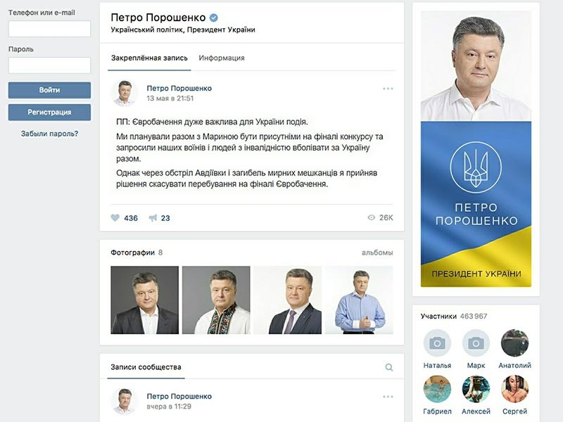 Петр Порошенко вступил в должность президента Украины 7 июня 2014 года. Его официальная страница в социальной сети "ВКонтакте" появилась в июле того же года. На ней сообщалось, что здесь "все неравнодушные будут иметь возможность обмениваться мыслями и идеями, делать все возможное для того, чтобы Украина жила по-новому", передавал украинский портал ТСН.