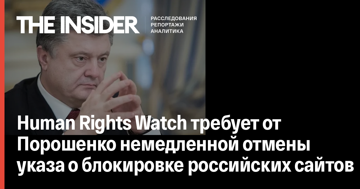 Президент Украины Петр Порошенко должен немедленно отменить указ о блокировке российских сайтов, включая «Яндекс», Mail.Ru, «Одноклассники» и РБК, и предпринять шаги по защите свободы слова и информации в стране. Об этом заявила международная правозащитная организация Human Rights Watch.