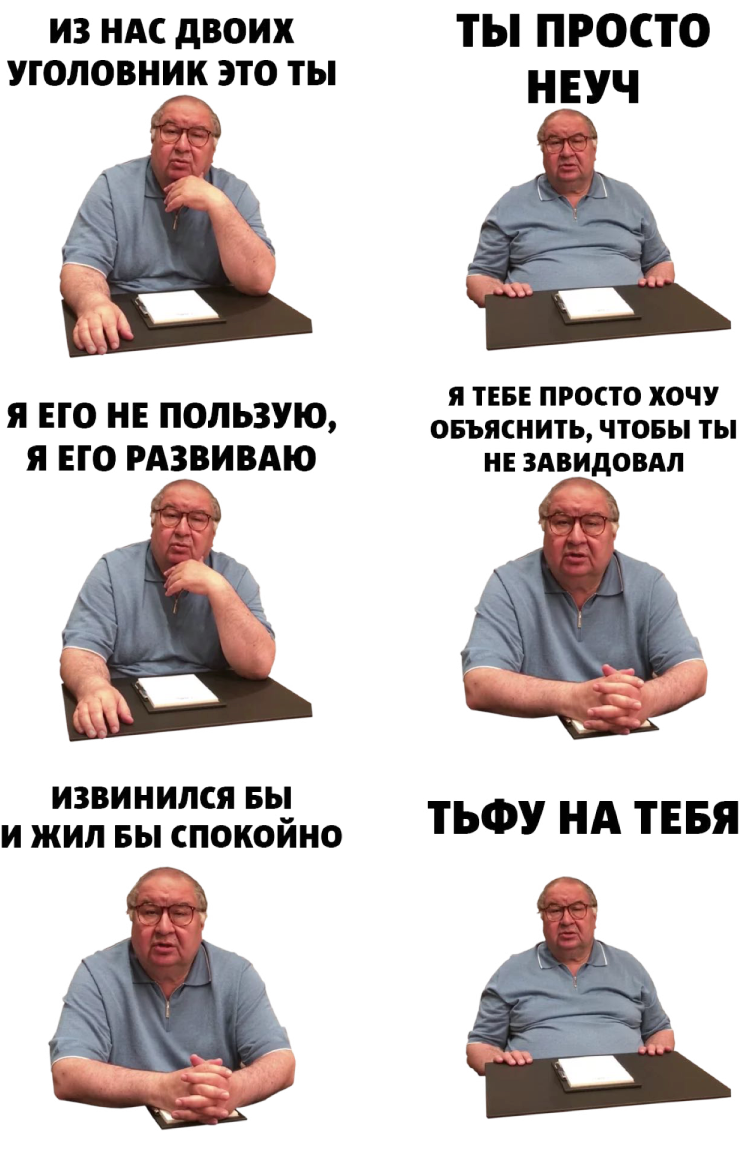 18 мая миллиардер Алишер Усманов опубликовал видеообращение к политику Алексею Навальному. Один 12-минутный ролик оказался полон ярких высказываний, которые немедленно разошлись на мемы. А еще видео с Усмановым оказалось идеальным материалом для изготовления коубов: пользователи накладывали на ролик треки «Касты» и «Кровостока», а также миксовали слова миллиардера с выдержками из фильмов.