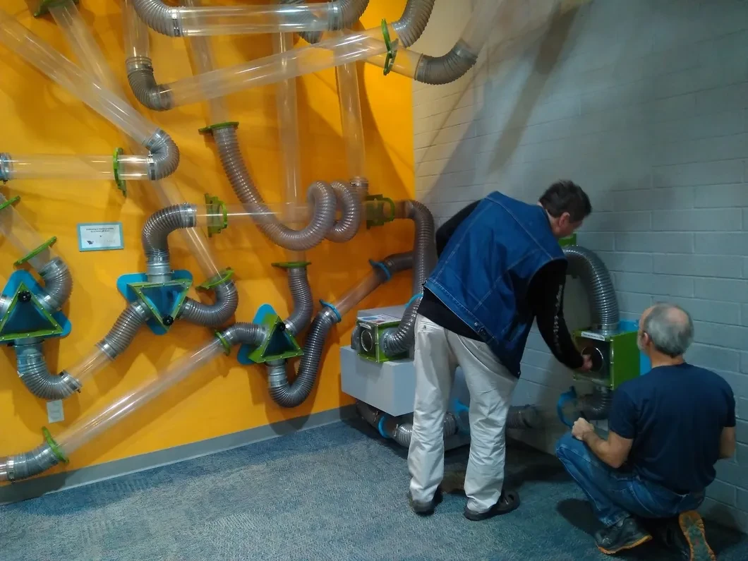 — Вот эти трубы пластиковые — видишь? — все своими руками. Сам покупал, сам гнул. Там пневматика. Вот видишь, мячик шерстяной? Положи его сюда. Видишь — он полетел?