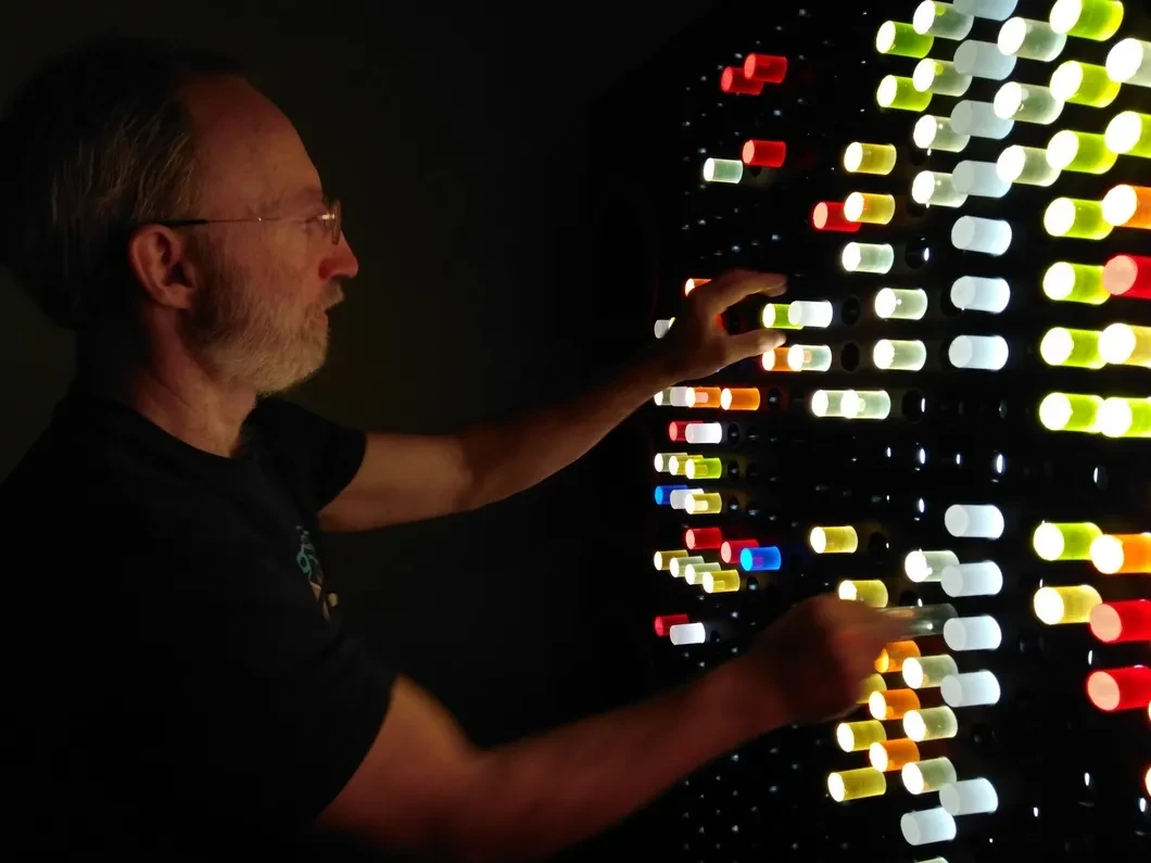 — А переключаем вот здесь — и он уже сюда полетел! А если здесь переключить — он вообще по всему периметру летает! Идем дальше. Тут световоды. Тоже я монтировал. Есть красные, синие, желтые, любые. И тут дырки. Какую картину захочешь, такую сам и смонтируешь. А вот тут можно рисовать светом по стене. Тут у нас железная дорога пущена. А тут можно сжатым воздухом стрелять: прицеливаешься в тарелку — она звенит!