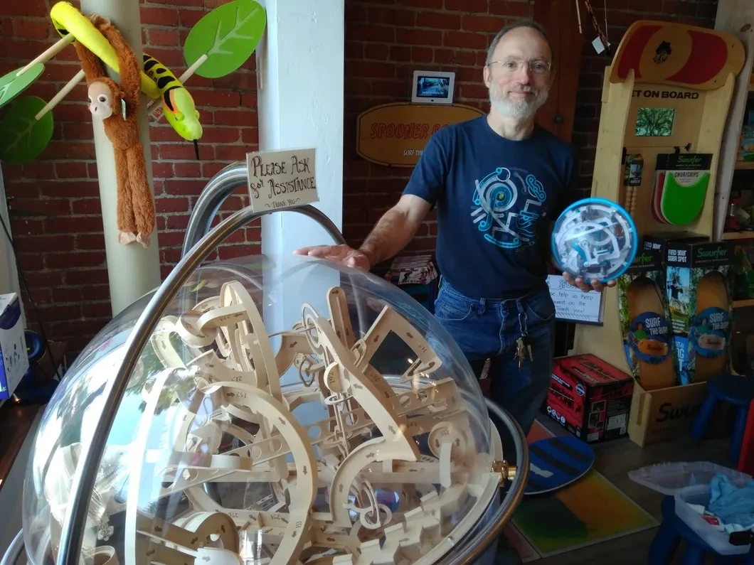 Ну и вот, у меня было с детства что-то вроде пространственного мышления. Я вообще-то в скульпторы хотел. И вот учитель дает задание — придумать трехмерную школьную доску, чтобы она раскладывалась, и можно было в ней демонстрировать всякие геометрические штуки. Так что первый мой шар был в форме куба. Там внутри помещалась лента Мебиуса, и по ней надо было гонять шар, чтобы она демонстрировала свои свойства. Ну вот, я придумал этот куб и его сделал, а потом заметил, что не только учитель сам гоняет шар с препятствиями, а младшие в семье тоже заинтересовались. И я делал эту штуку иногда в подарок, или если кто попросит, — а для себя придумывал всякие усложнения, петлю там или лестницу, пока тридцать лет спустя, сравнительно недавно, не заинтересовались производители. Его стали делать в Китае, я с дочкой туда съездил посмотреть, как они работают, — хорошо у них это поставлено! И я получаю, — сказал он гордо, — с каждого шара две десятых процента. На жизнь хватает.