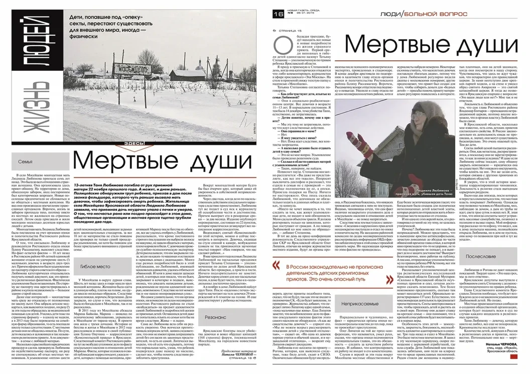 Напомню предысторию. В приюте в деревне Мосейцево при странных обстоятельствах умирает 13-летняя Таня — одна из шести приемных дочерей основательницы православного приюта Людмилы Любимовой. По утверждению Любимовой, смерть девочки наступила после ее падения во сне с печки. Эта версия сразу же вызывает сомнение у следствия, так как выясняется, что на протяжении нескольких лет общественники пытались привлечь внимание властей к странному приюту, где явно творилось неладное, были подозрения, что с детьми обращаются жестоко. Однако многократные заявления в органы опеки оказывались тщетными. Приют якобы неоднократно «проверяли», и репутация его оказывалась всякий раз безупречной. Вместе с Любимовой воспитанием детей, а сколько их достоверно прошло через приют, не знает никто, занимались ее единоверцы Руфа Гусманова и Гузель Семенова.