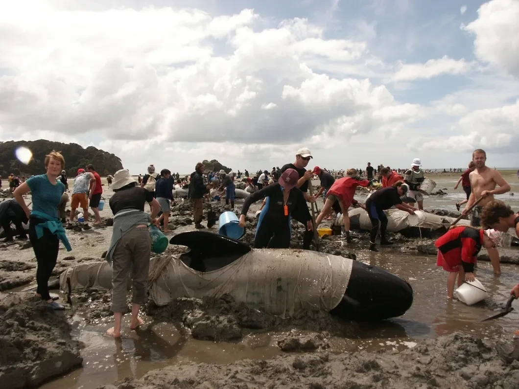Весть разносится быстро — и все жители Голден-Бей бросаются на помощь. Жители прибрежной деревушки открывают двери своих домов — пускают волонтеров подкрепиться, отдохнуть, переночевать. Тащат на берег ведра — поливать животных, простыни, чтобы накрыть их от перегрева.
