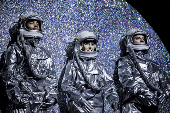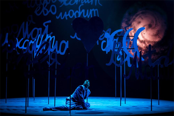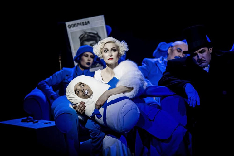 © Ира Полярная Премьера в Театре наций — де-факто сиквел «Земли», относящийся к тому времени, когда «хорошая» команда синих одержала безоговорочную победу. Синий цвет повсюду, не только в одежде: стол — синий, еда на нем — синяя, цветы — синие, волосы, бороды — синие, даже ростовые куклы-львы — и те синие. Странно, что нет синей птицы — при таком-то всеобщем счастье. Персонажи живут в абсолютно гомогенной среде, где чужак заметен издалека, как на снежном поле: черный фрак немецкого антрепренера Франца фон Кнейшица сразу выдает в нем эксплуататора-капиталиста. Поселить героев Александрова в небесной синеве придумала художница Мария Трегубова; ей же принадлежит пространственное решение спектакля — наклонный цирковой манеж и такой же круглый экран. Он нужен Трегубовой не только для того, чтобы в реальном времени транслировать крупные планы артистов: экран превращается то в иллюминатор с видом на футуристическую Москву, то в массивную натуралистичную луну, то в пылающее недоброе солнце.