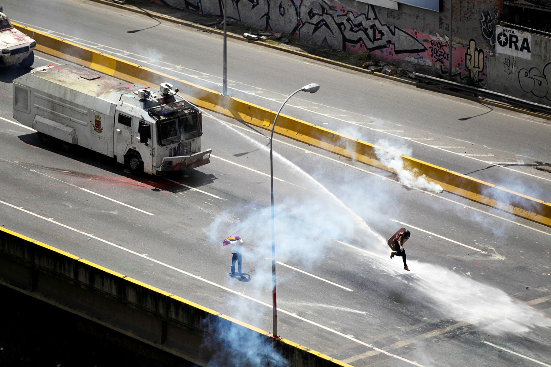 Фото: Christian Veron / Reuters / Scanpix / LETA Полиция применяет водомет при разгоне акции противников президента Венесуэлы Николаса Мадуро в Каракасе 18 мая 2017 года. Массовые оппозиционные выступления продолжаются в Венесуэле с начала апреля. За это время в столкновениях с полицией погибли более 40 человек.