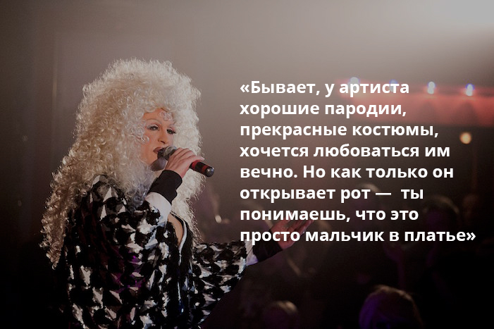Не всем дано быть с микрофоном. Бывает, у артиста хорошие пародии, прекрасные костюмы, хочется любоваться им вечно. Но как только он открывает рот — всё. Шик, блеск, красота уходят, и ты понимаешь, что это мальчик в платье, что это халда, хабалка, и тебе уже неинтересно, в каких бы золотых корсетах он ни был.