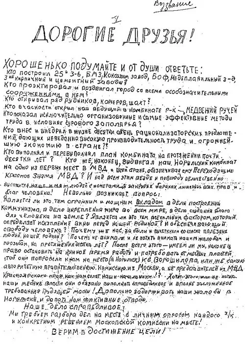 … На 50-летие восстания ее участники приняли «Обращение к соотечественникам». Одна цитата: «Судьба нашей страны не была игрушкой в руках вождей, медленное освобождение от крайностей тоталитаризма не было даром великодушных правителей. Наша забастовка, другие лагерные выступления подорвали основу коммунистического режима — гигантскую империю ГУЛАГа. Народ начал сам свое освобождение, толкая в спину партийных реформаторов».