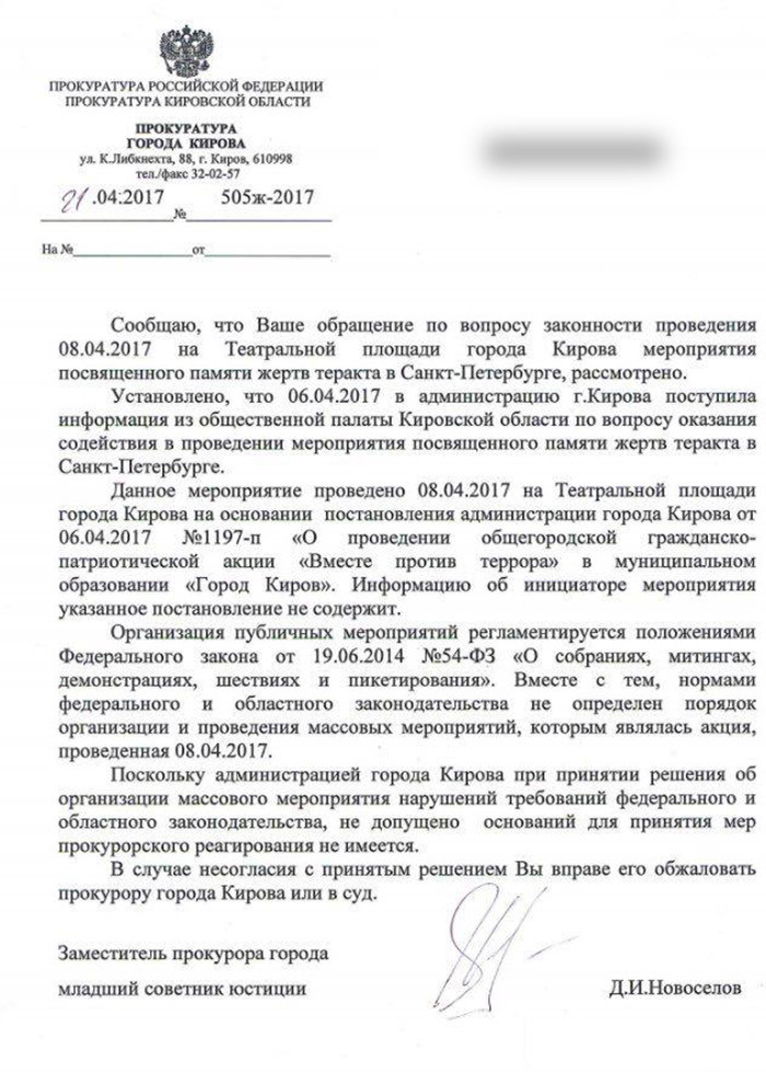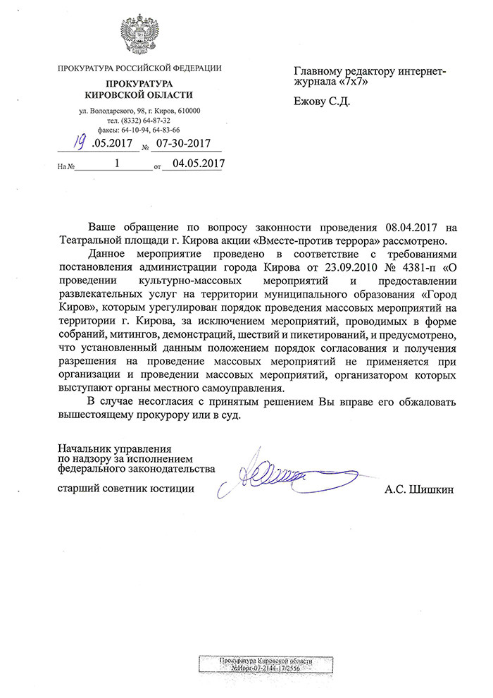 28 апреля в редакцию пришел ответ прокуратуры. В нем говорилось, что акция на Театральной площади регламентируется постановлением администрации Кирова № 4381-п. Это постановление о порядке проведения массовых мероприятий, за исключением собраний, митингов, демонстраций, шествий и пикетирований. Поэтому в прокуратуре сделали вывод, что федеральное законодательство о публичных акциях (например, по срокам подачи уведомлений) в этом случае не применимо. Ведомство не нашло мер для реагирования.