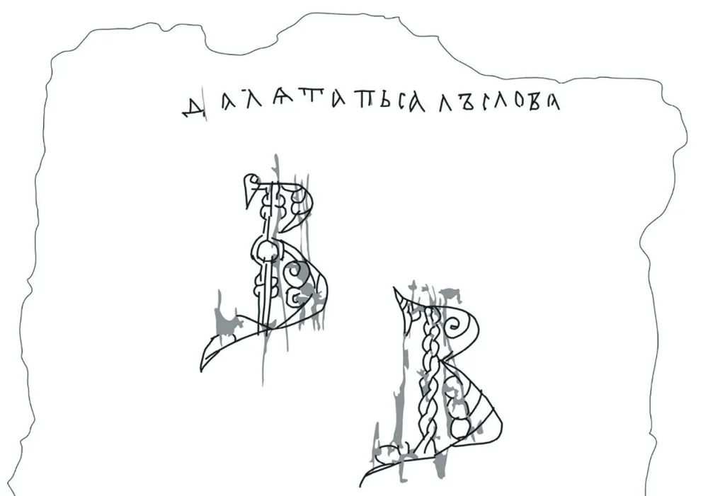 Авторы некоторых надписей, несомненно, были профессиональными книжными писцами — например, Далята. Одна из записей выглядит так: Далята пъсалъ слова (ил. 6). А ниже мы видим два очень красивых и профессионально сделанных инициала (фигурные буквы В). Такие мог выполнить настоящий мастер своего дела. Есть еще одно упоминание Даляты в соборе: Шестый день поста жгоша Даляту. Сожгли, конечно же, скорее всего, не Даляту, а его двор — возможно, во время языческих мятежей в XI веке.
