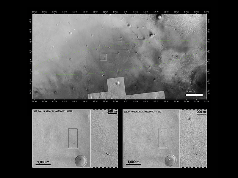 Schiaparelli упал с высоты два-четыре километра на скорости около 300 километров в час. Вскоре был опубликован снимок места его падения, сделанный американским космическим аппаратом Mars Reconnaissance Orbiter.