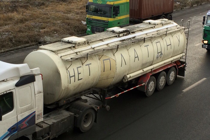По данным издания, дальнобойщиков задержали за флаги организации на фурах и за плакаты с антиправительственными лозунгами. Водителей пока не доставили в отделение, протоколы на них не составлены.