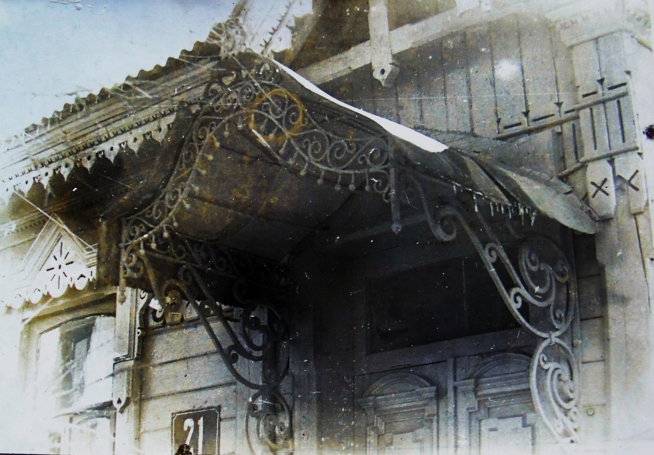 Среди иллюстрировавших работу любительских фотографий мое внимание особенно привлекла одна, с неизвестным мне красивым деревянным зданием №21 по улице Сакко и Ванцетти. Сейчас этой улице возвращено историческое наименование – Карачевская, но дома с таким номером там уже нет. Он и еще ряд соседних с ним зданий на перекрестке с 1-й Посадской были снесены вскоре после того, как был сделан тот снимок, в начале 1980-х. Официально дома были признаны ветхими и непригодными для жилья. Однако на самом деле городу просто требовалось место для возведения нового здания райсовета Заводского района. Кое-кто из очевидцев их сноса рассказывал, как об один из якобы ветхих срубов сломался железный ковш экскаватора. Может быть, это был тот самый дом №21 – очень добротное и крепкое деревянное здание из дубовых бревен, сверху обшитое тесом и украшенное ажурной резьбой. На фотографии из попавшей ко мне работы был заснят изящный кованый козырек его уличной входной двери, а также хорошо видны резной карниз и верх одного наличника. А еще у дома было необычное для нашего города решение входа с так называемым щипцом. Верхняя часть стены его входной галереи была сделана треугольной формы и охватывалась небольшой двухскатной крышей, отделенной от крыши основного здания.