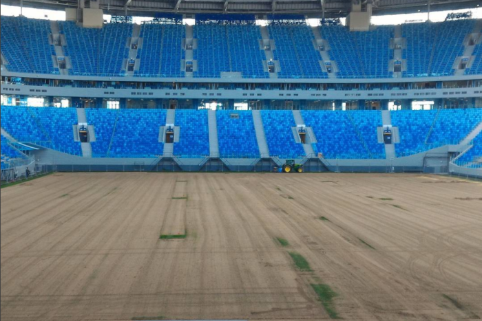 Накануне на «Санкт-Петербург Арене» полностью срезали газон. К началу матчей Кубка Конфедераций на стадионе уложат рулонный газон.
