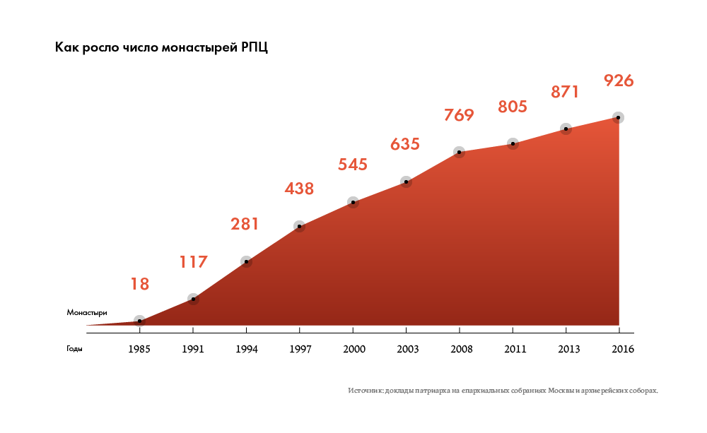Поэтому число монастырей, когда их разрешили, выросло взрывными темпами — в 50 раз за 30 лет. В СССР в 1985 году их было 18, а на начало 2016 года — 926 (455 мужских и 471 женский).