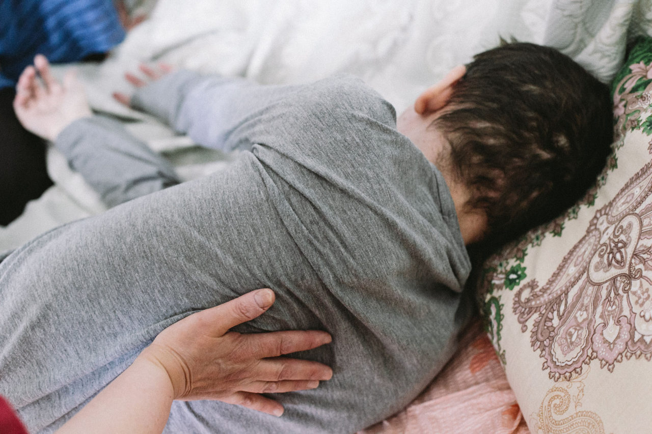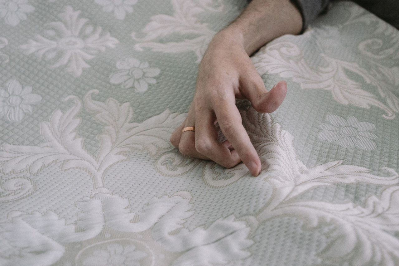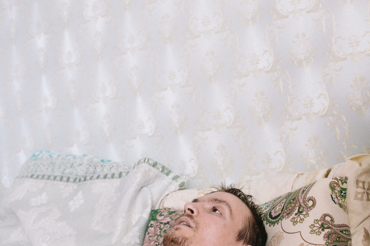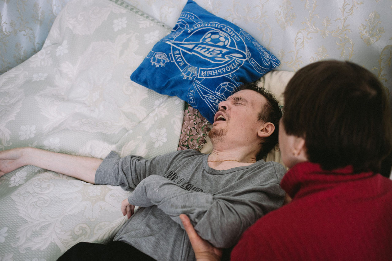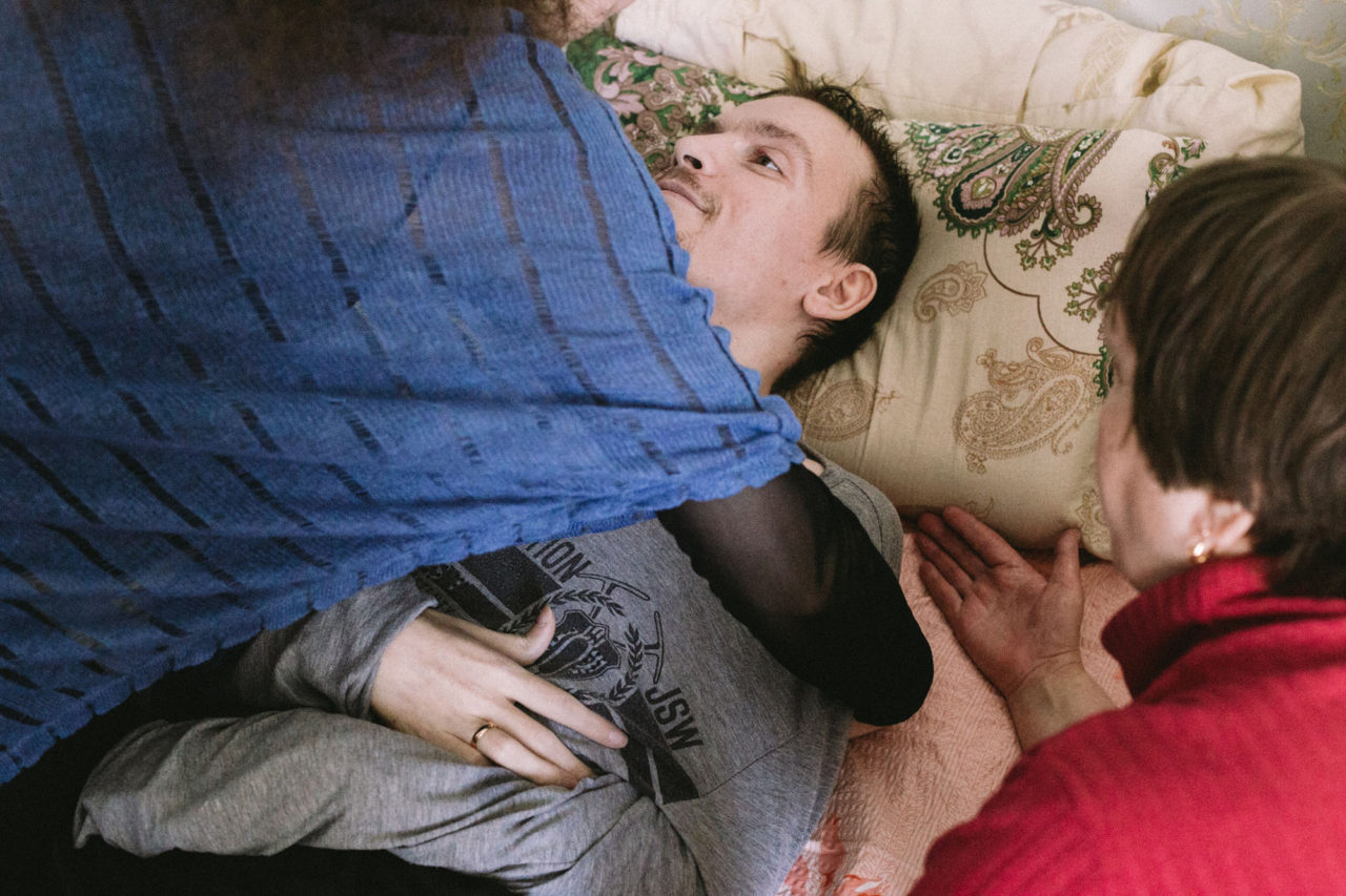 Дверь открывает молодая женщина Юля. В маленькой комнате на кровати неподвижно лежит ее муж Сергей Карчеменко: руки сложены на груди, на шее — цепочка с крестиком.