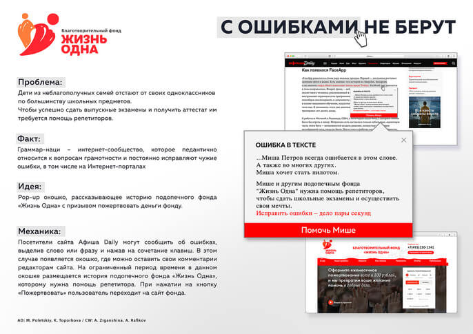 8. «С ошибками не берут». Проект благотворительного фонда «Жизнь одна» и Афиша daily. Читатели сайта Афиши могут исправить орфографические ошибки, какие заметят. При выделении слова будет появляться специальное окно от благотворительного фонда. В нем рассказывается история подопечного, посетитель также сможет легко сделать пожертвование. Авторы: Андрей Рафиков, Кира Топоркова, Анна Зиганшина, Максим Полецкий.
