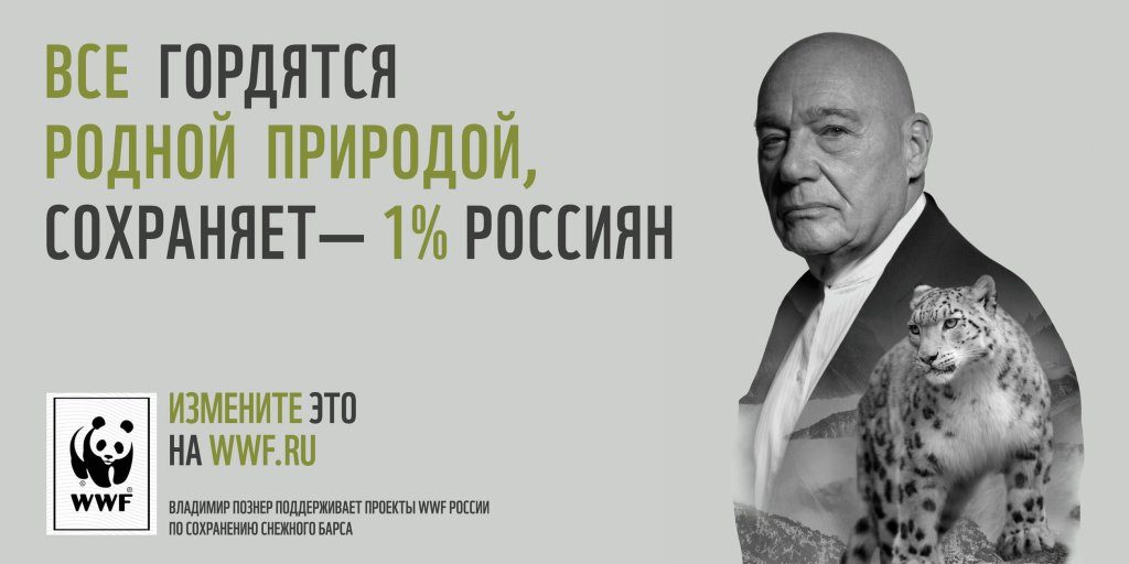 7. «1% россиян». Проект директора по маркетингу и коммуникациям всемирного фонда дикой природы (WWF) России Юрия Сочнева. Это серия постеров с известными людьми, которые поддерживают фонд: певцы Илья Лагутенко и Диана Арбенина, телеведущий Владимир Познер.